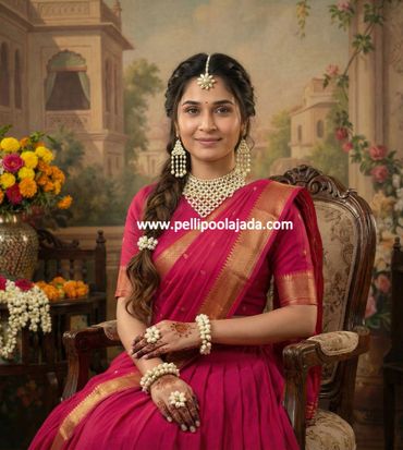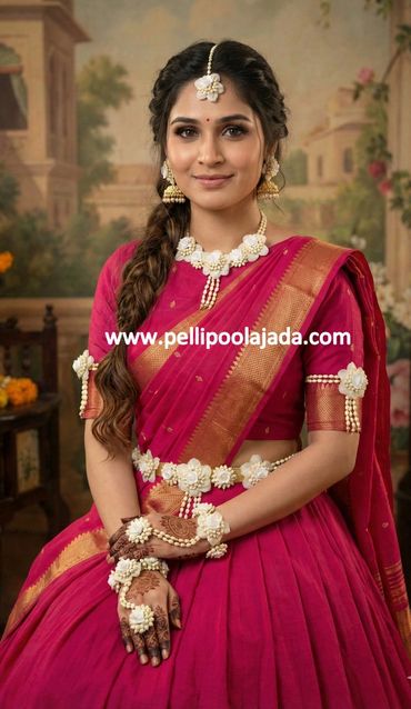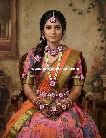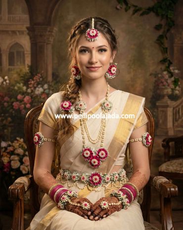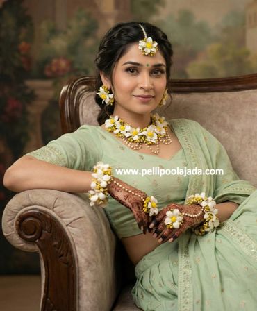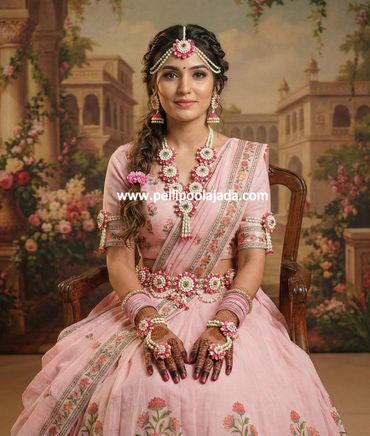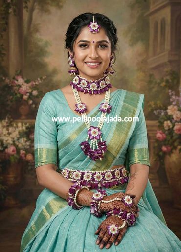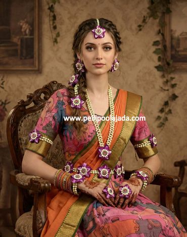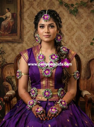 We are the original Pellipoolajada. We have 100 plus unique floral hairdo designs. Fresh flower jewellery, Fresh floral venis, orchids veni, venis, jasmine veni available. Wedding doll sets, Aarthi plate decor, Addutera online available. pelli butta available, Best kobbari bondam designs, wedding umbrellas available, wedding accessories online . Contact us - 9441455334